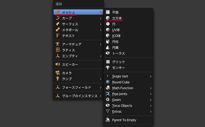 [Shift]+[A]→[メッシュ]→[立方体]。